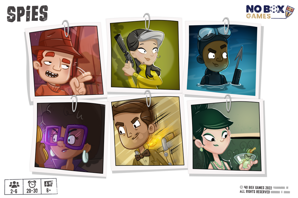 Spies is a game of hidden movement and deduction for 2-6 players, 20-30 minutes, ages 8 and up. You’re all spies that have infiltrated an ambassador’s mission, and each of you is tracking the player on your left (your Target). Complete your own missions, try to sabotage your Target’s missions, and figure out where your Target ends up for bonus points.